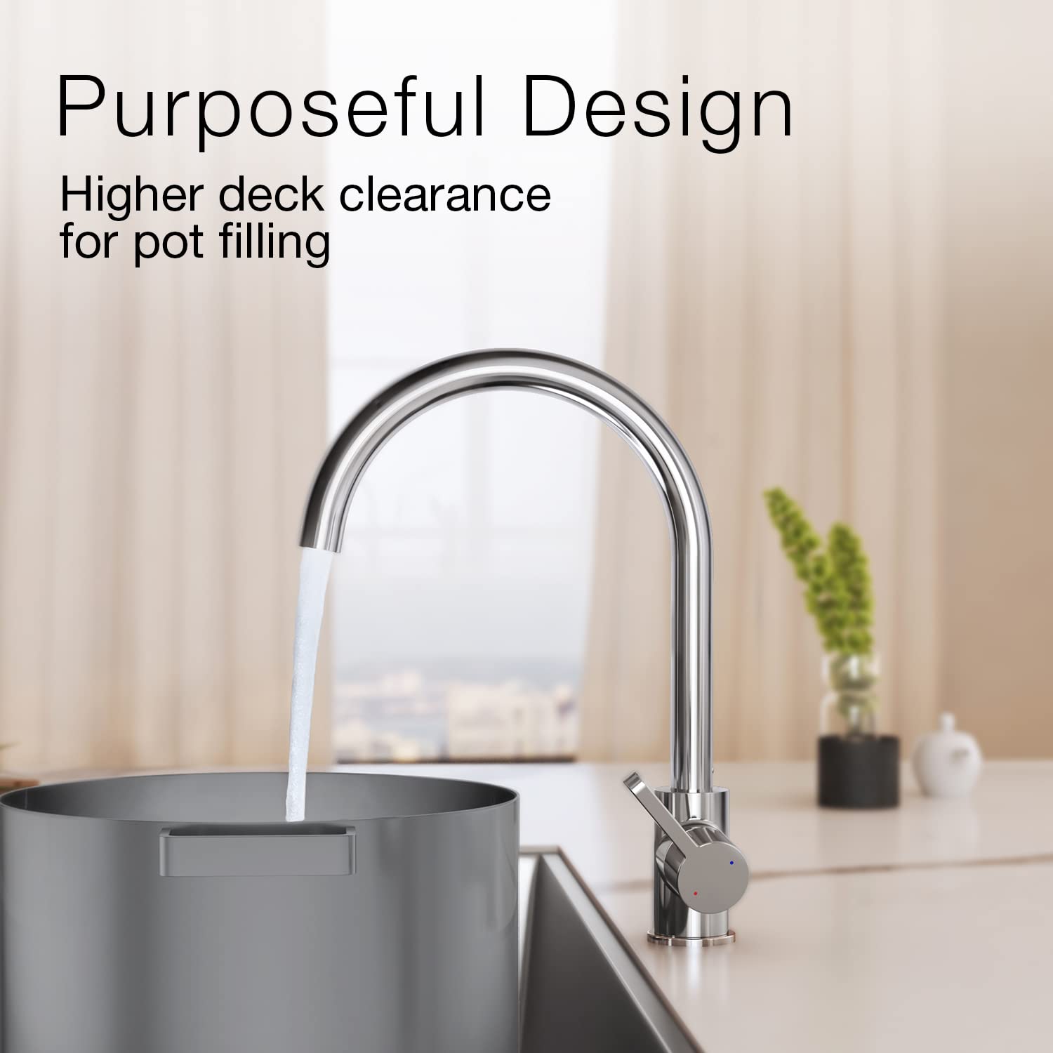 Deck-mounted kitchen faucet with single handle, hot & cold water, 360° swivel, aerated flow for water saving. 10-year warranty, polished chrome finish.